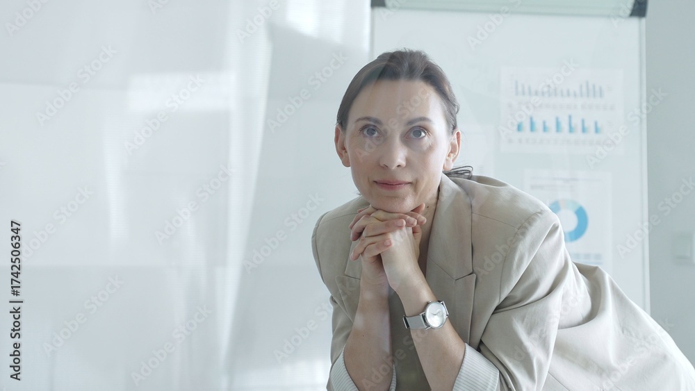 Professional woman resting hands on desk, strategizing amid workplace analytics dashboard with data visualizations surrounding workspace. Business people concept
