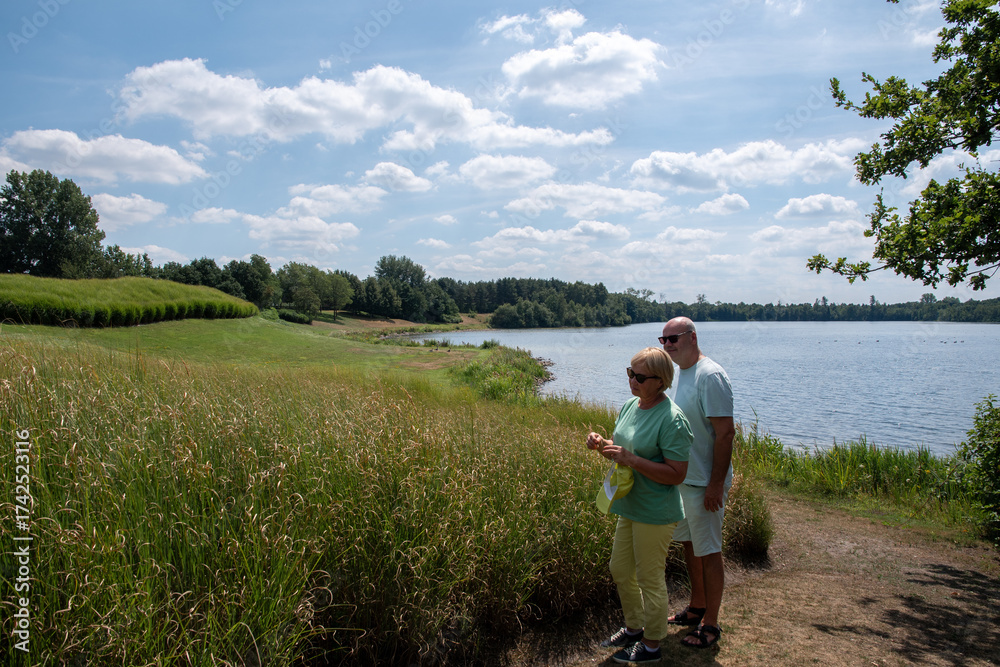 Senior couple standing by a tranquil lake, observing the scenic landscape and enjoying a peaceful moment together under a clear sky, embracing relaxation and a healthy lifestyle