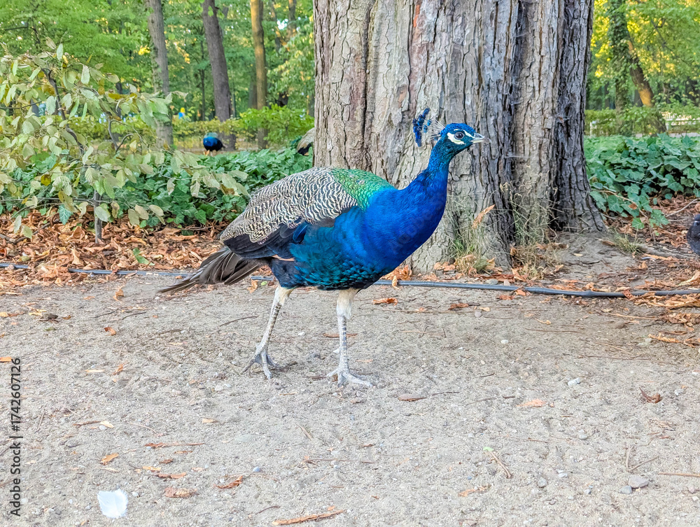 Beautiful blue peacock bird walking on forest ground covered with brown leaves and green vegetation in natural habitat. High quality photograph.