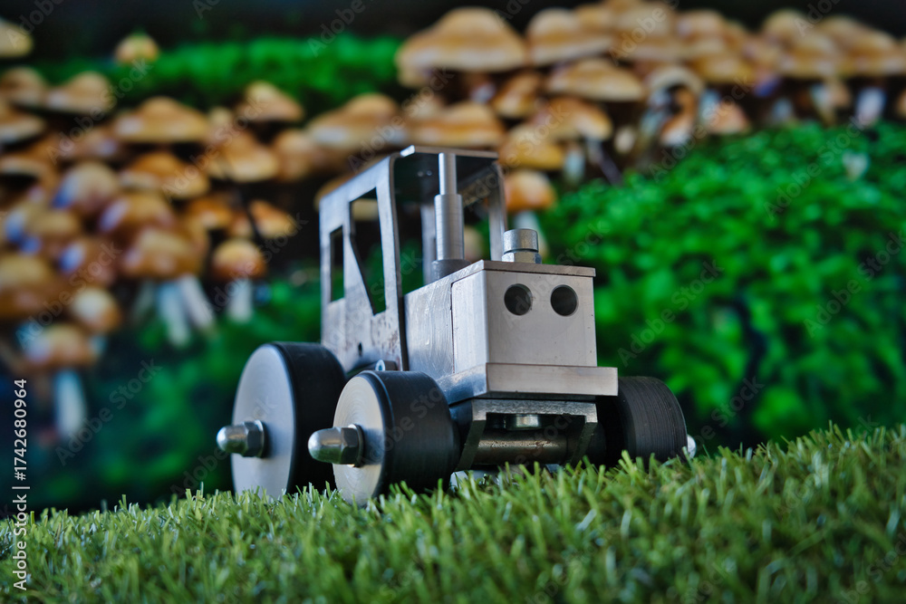 A whimsical macro scene where a toy tractor meets a mushroom forest—blending childhood, fantasy, and industry in a playful visual metaphor. Ideal for themes of creativity, storytelling, and innovation