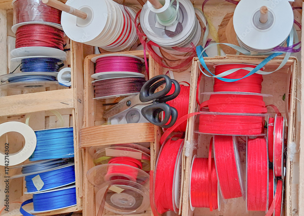 Colorful ribbons and scissors arranged in wooden boxes for crafting and decoration