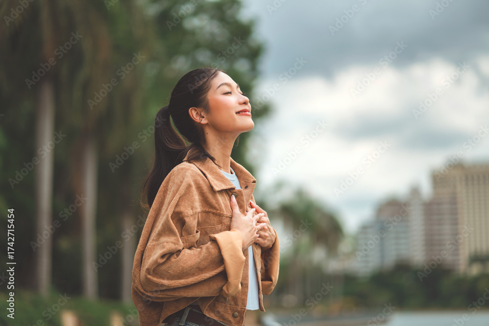 Carefree asian woman standing in city park enjoying fresh air and nature – happy female smiling and breathing deeply in urban green space, mindful wellness lifestyle and outdoor relaxation