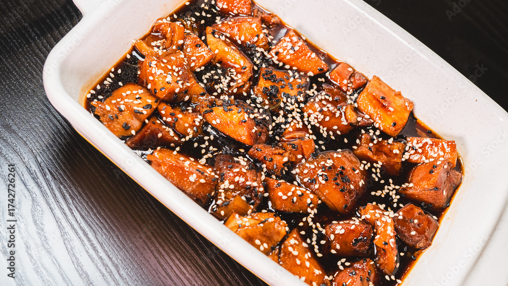 Delicious sticky pork chunks glistening with soy-honey tare glaze. Generously coated in sweet-savory sauce and topped with sesame seeds, served sizzling in an elegant serving dish.