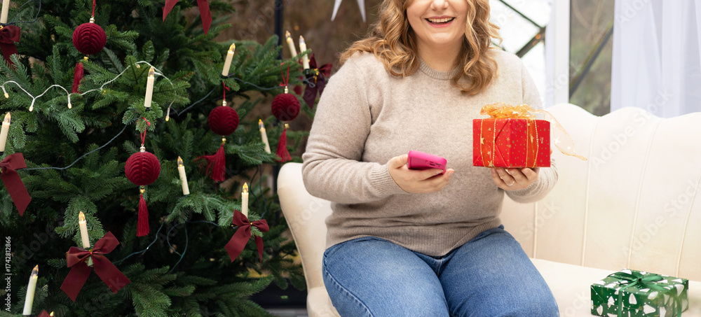 Young beautiful woman sitting near decorated Christmas tree in living room on sofa, smiling and using phone, typing message on smartphone, celebrating new year and Christmas. Holiday banner