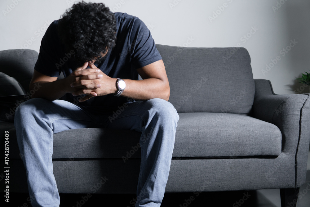 Young man experiencing mental stress on sofa