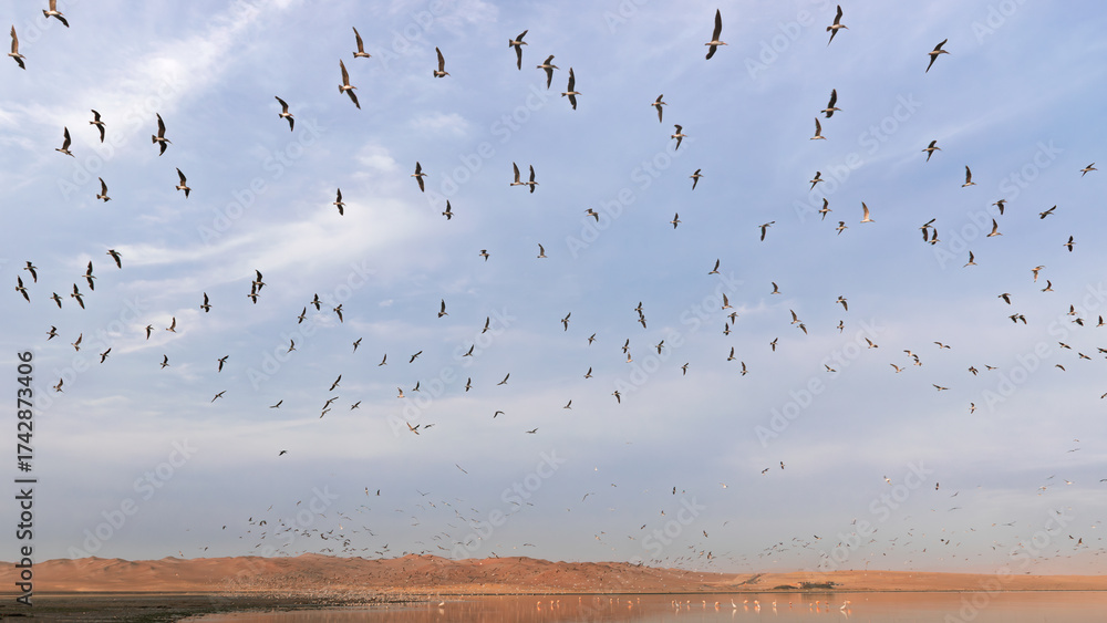 Birds in flight in Paracas, Peru lines in the sky, earth magnetic field, orientation