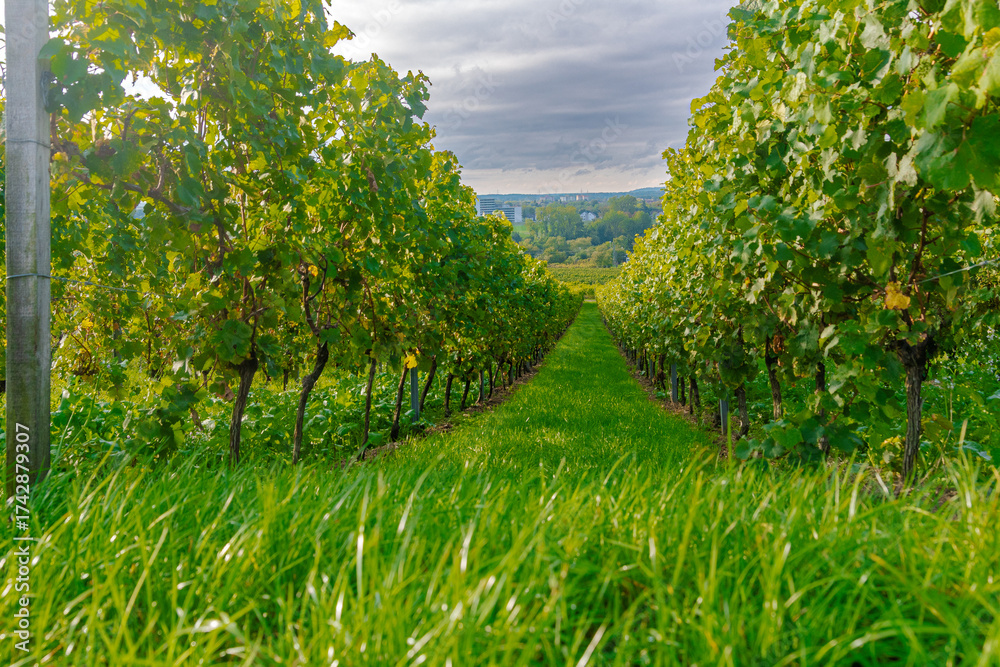 Scenic vineyards in Hochheim am Main with historic church and traditional German village in the Rheingau wine region, picturesque countryside landscape in Germany