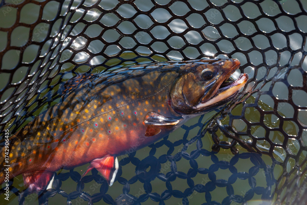 Colorful brook trout male in spawning colors in a landing net on a fall day