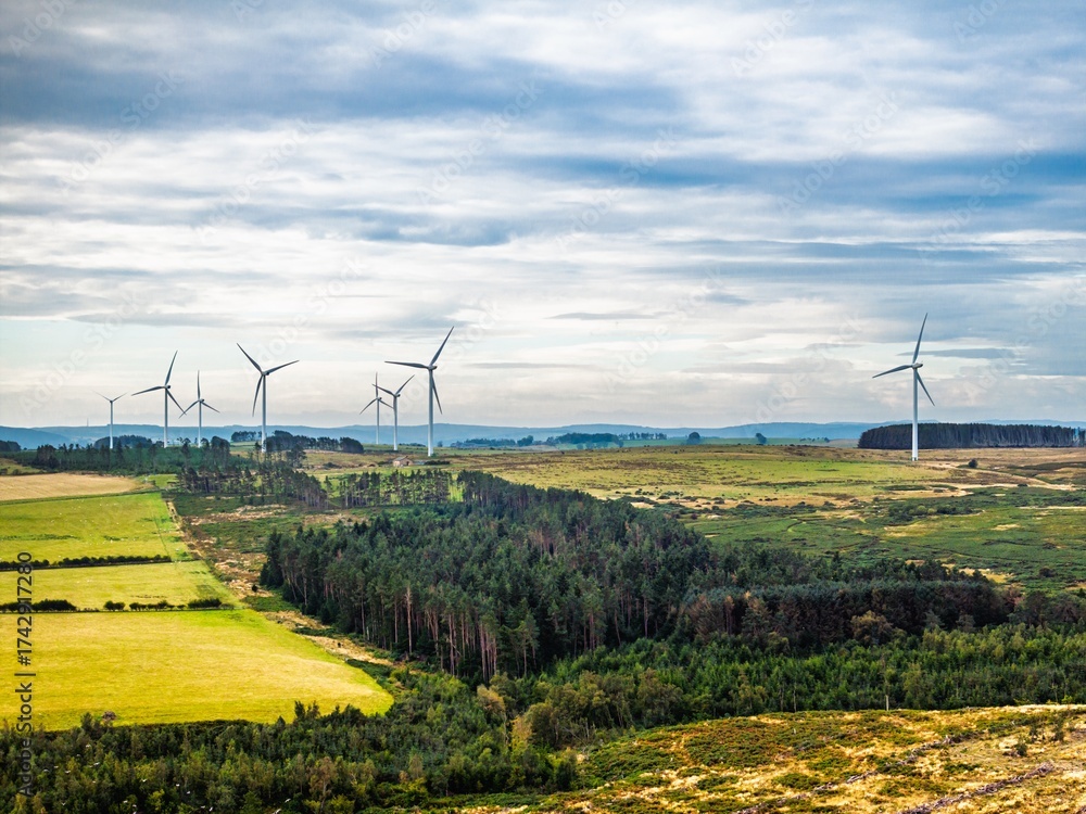 Wind Farm over heathlands and fields from a drone in Nord England, UK