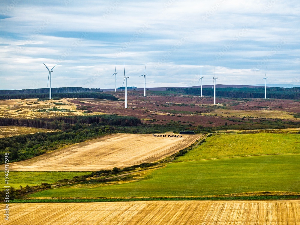 Wind Farm over heathlands and fields from a drone in Nord England, UK