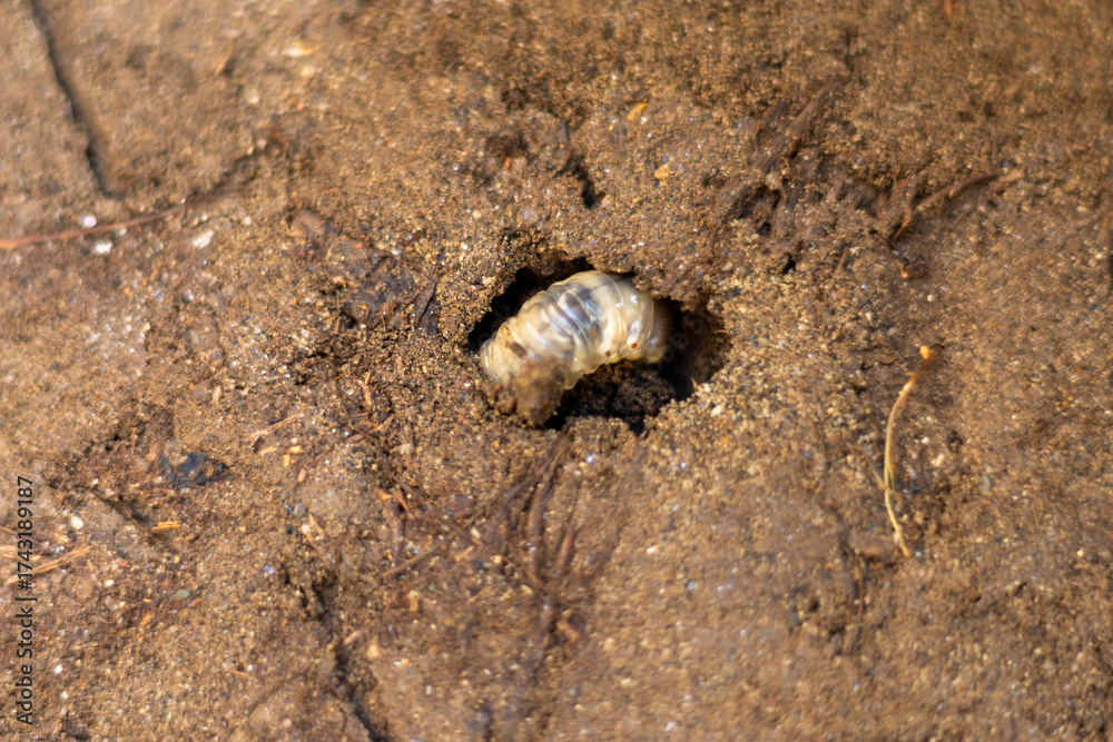 Close-up of Garden Grub Larva Emerging from Soil, Macro Insect in Earth.