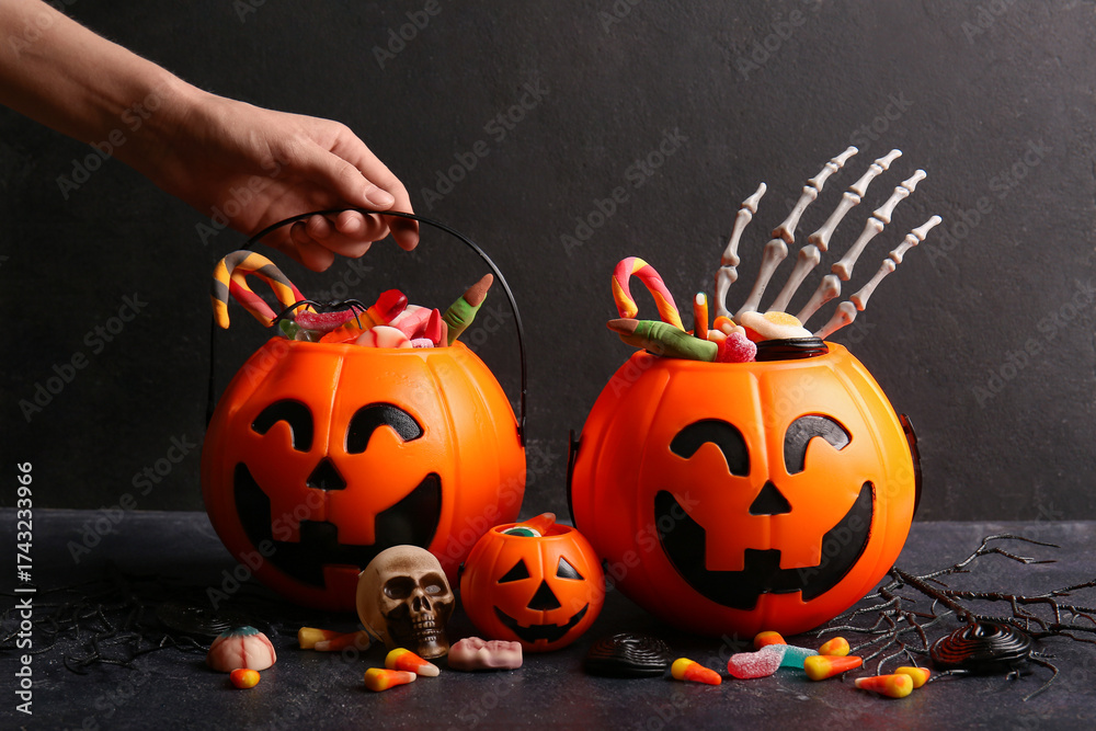 Female hand with decorative pumpkins of different sweet candies on dark background. Halloween celebration