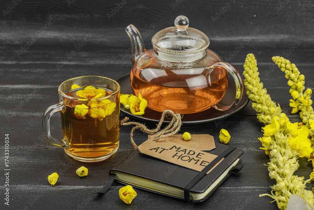 Glass cup of mullein flower tea with teapot and notebook on black wooden table, healthy drink