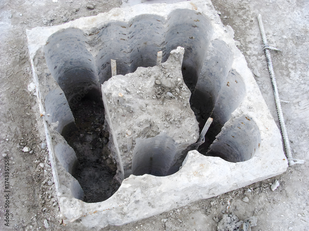 Concrete block with drilled holes and exposed rebar on a construction site.