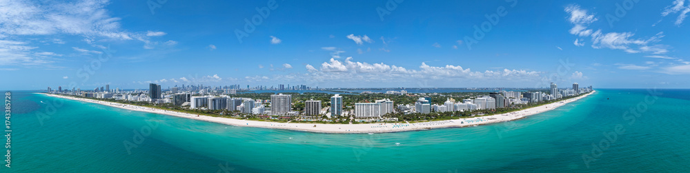 Aerial panorama of Miami Beach coastline. Stunning Miami skyline panorama. Drone panoramic view of Miamis view. Downtown Miami waterfront cityscape. South Beach panorama.