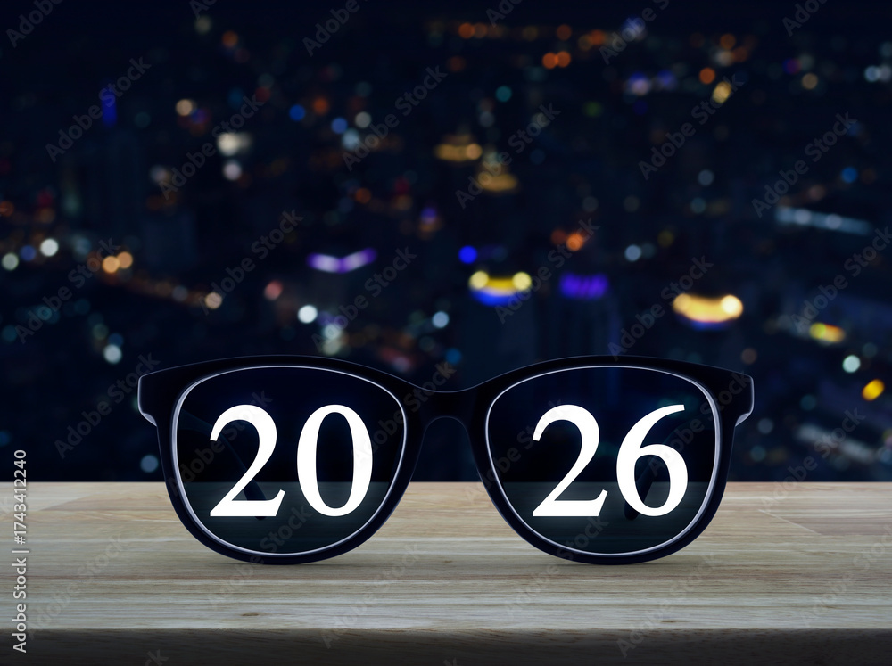 2026 white text on black eye glasses on wooden table over blur colorful night light modern city tower and skyscraper, Business vision happy new year 2026 concept