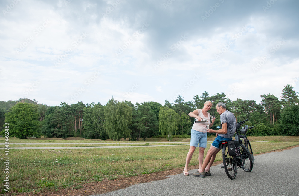 Senior adult couple enjoying refreshing hot drinks from thermos during pleasant cycling journey, taking break outdoors on a scenic bike path through a natural park