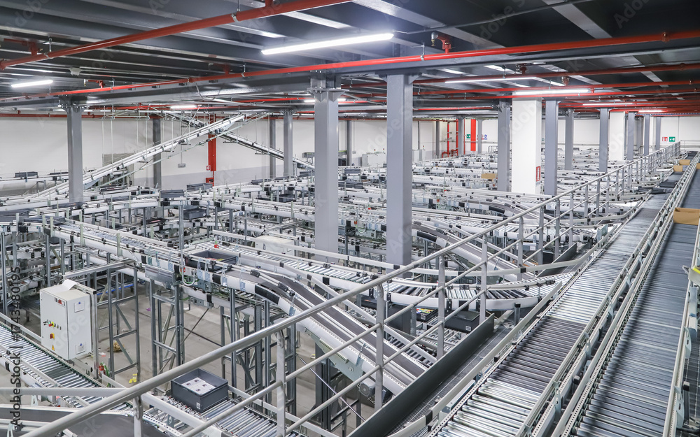 packing line in a logistics warehouse. conveyor belt in a modern production line