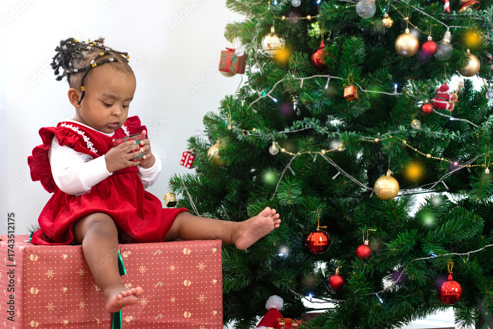 A cute African little girl with braided hair and a red dress sits on a gift box near a Christmas tree.