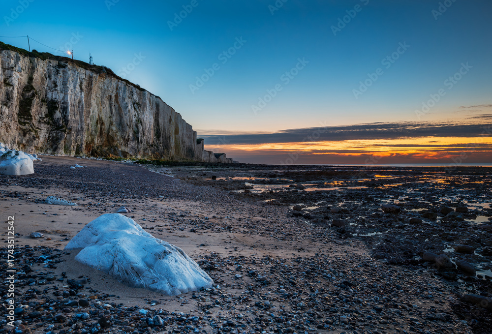 The pebble beach and the cliffs of Ault at sunset, alabaster coast, department of Seine Maritime, Normandy region, France.