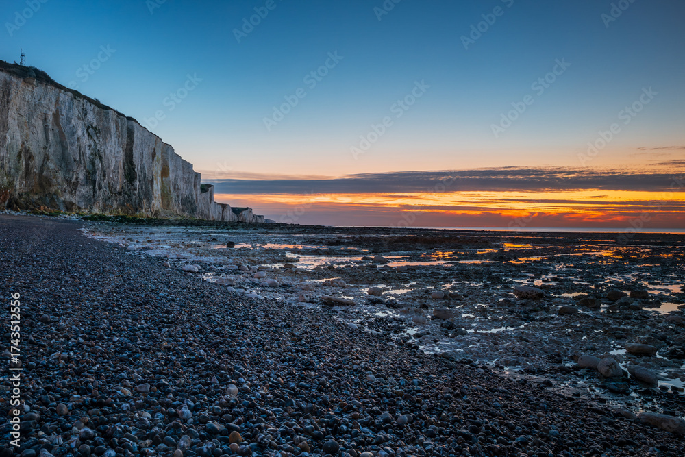 The beach and the cliffs of Ault at sunset, alabaster coast, department of Seine Maritime, Normandy region, France.