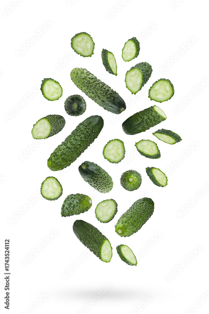 Crisp small young green cucumber whole, cut levitation as flow in art composition, isolated. Fresh natural organic summer food as design element for salads, detox diets, healthy eating, fitness meal.