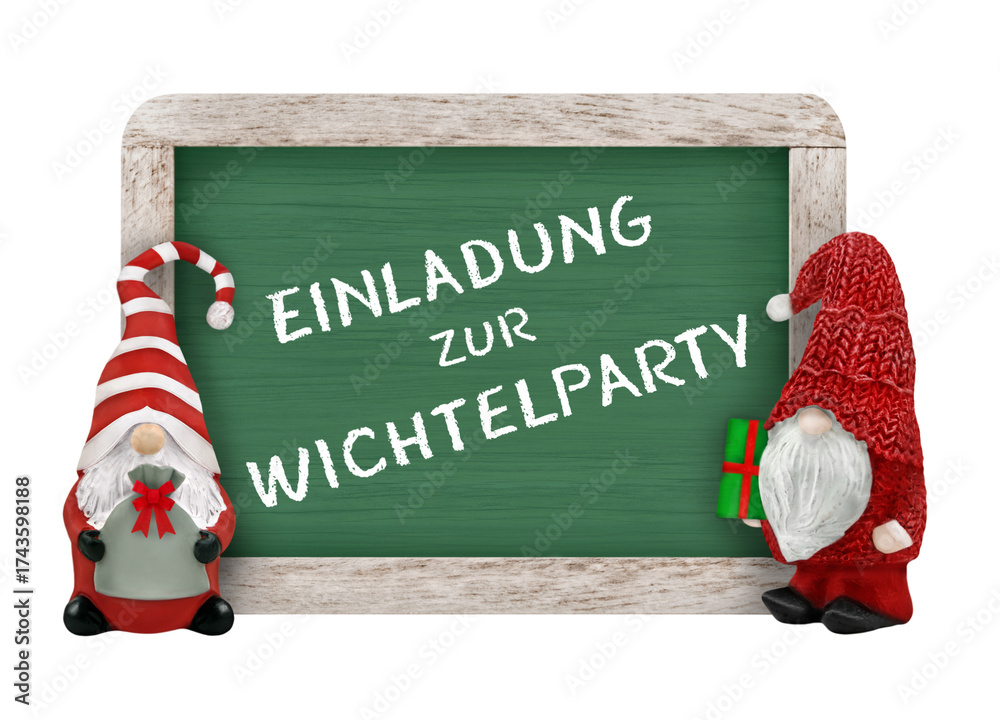 Einladung zur Wichtelparty mit Wichtel und Tafel Hintergrund transparent PNG cut out