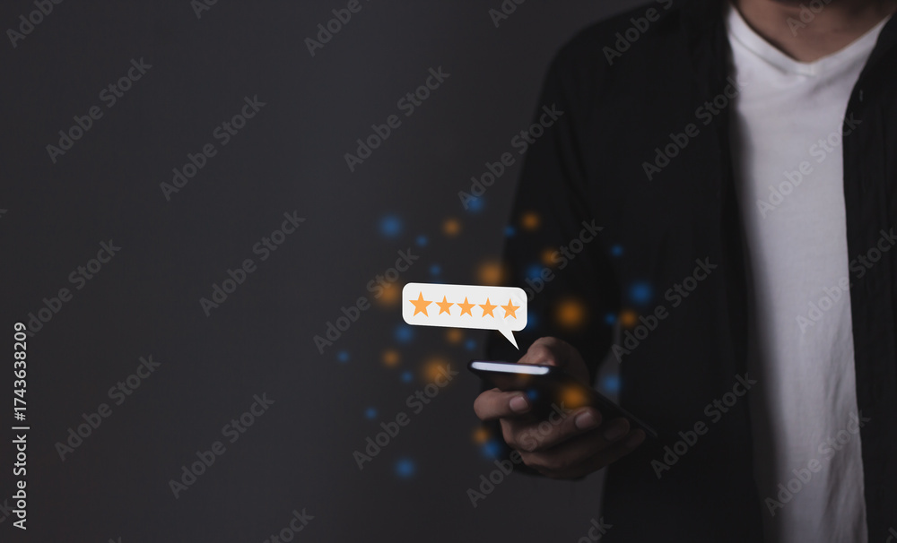 Excellence Review, Young Man hand holding Smart Phone with five star to review and give 5 stars with very good results in service, Good review 5 star rating choice feedback