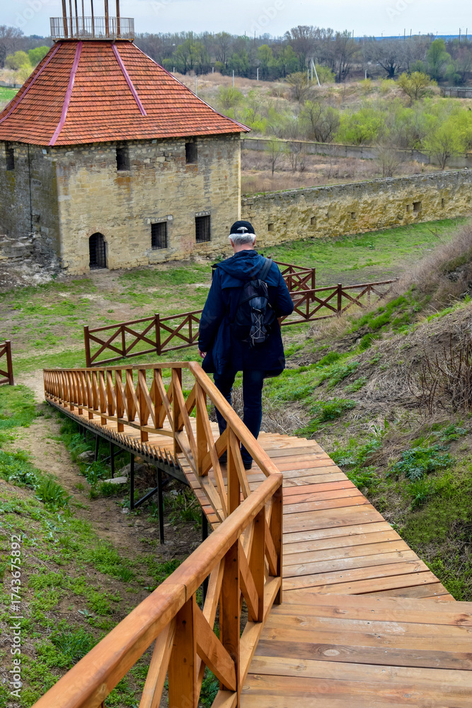 One gray-haired Man Tourist on a tour in an ancient fortress, landmark. Back view. Bendery, Moldova
