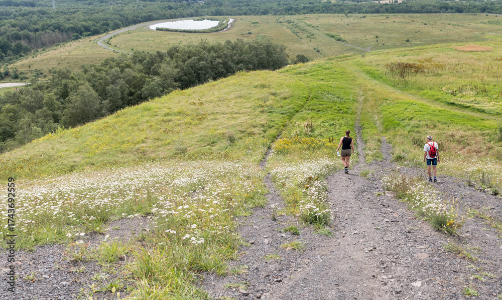 Couple hiking a rural path through a wildflower meadow, enjoying nature and outdoor activity on a beautiful summer day, descending a hill with green landscape and a lake in the background