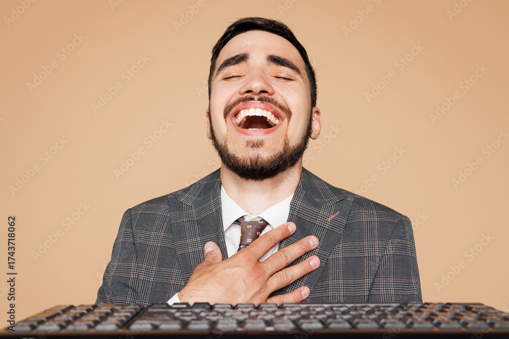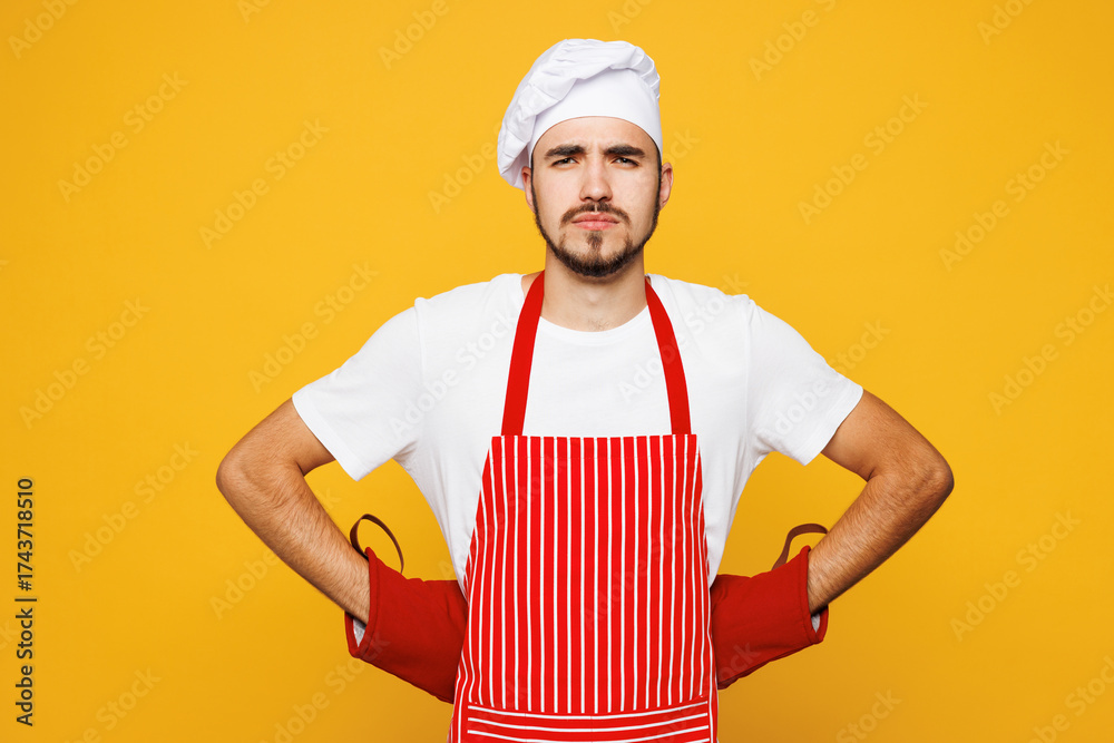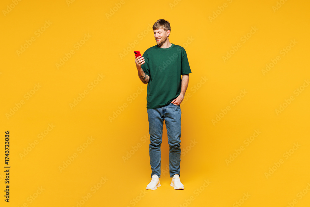 Young sad mad grumpy Caucasian man he wearing green t-shirt casual clothes hold hands crossed folded looking camera isolated on plain yellow orange wall background studio portrait. Lifestyle concept.