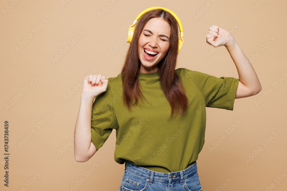 Young smiling happy woman wears olive green t-shirt casual clothes listen to music in headphones raise up hands dance isolated on plain pastel light beige background studio portrait. Lifestyle concept