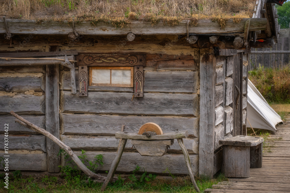 Charming rustic wooden cottage featuring a stone grinding wheel and thatched roof, nestled in a serene natural environment. Perfect for heritage themed projects, Wolin, Poland
