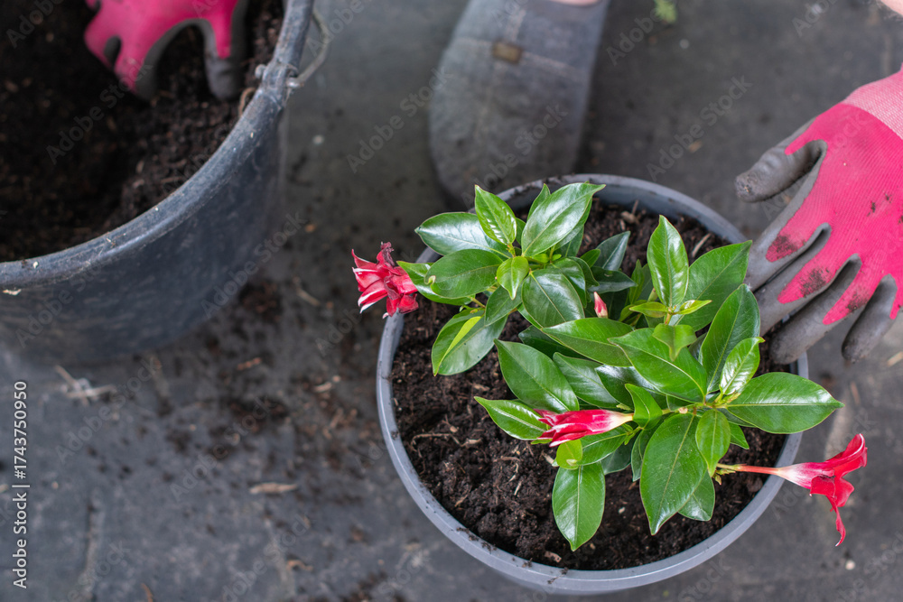 Person wearing pink gardening gloves repotting a vibrant red mandevilla plant, adding fresh soil to a dark gray pot, engaging in a popular outdoor hobby and horticulture activity