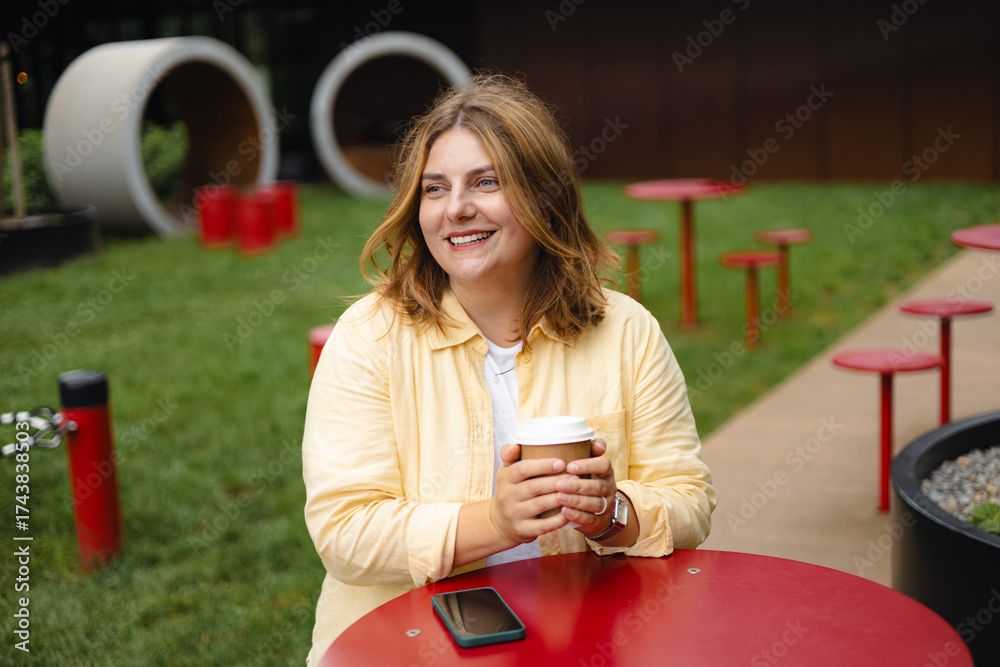 Happy 30s blonde woman enjoying her cup of cappuccino outdoors in cafe, weekend mood. Urban lifestyle concept.