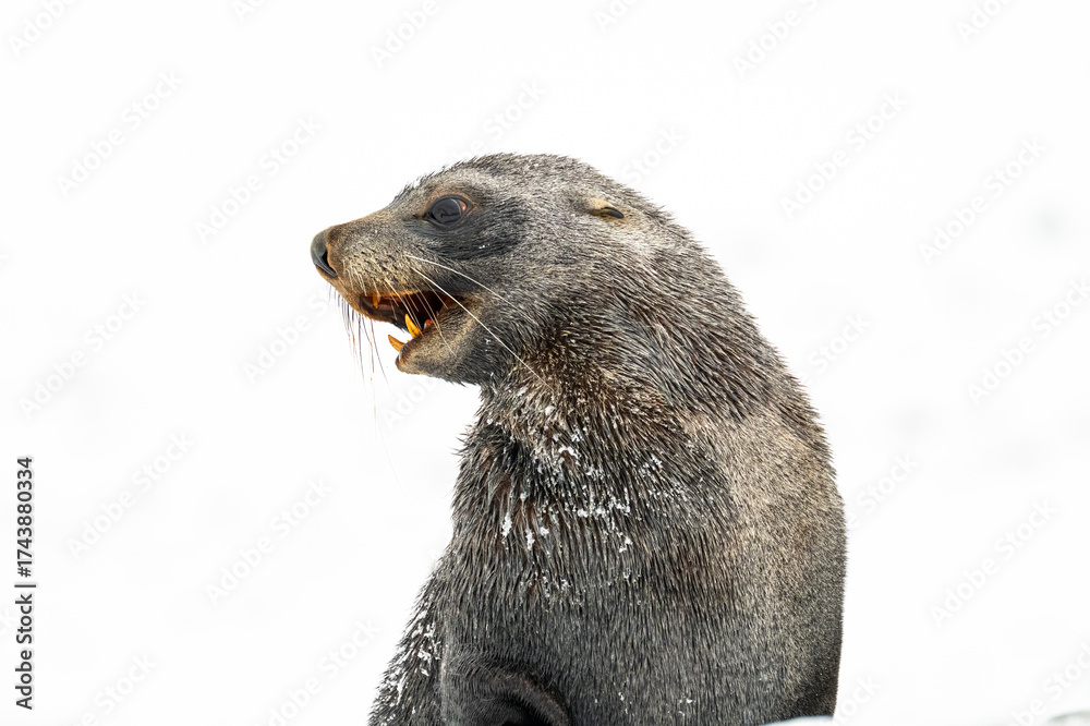 A closeup of an Antarctic Fur Seal (Arctocephalus gazella) with mouth open against a white background in Antarctica.
