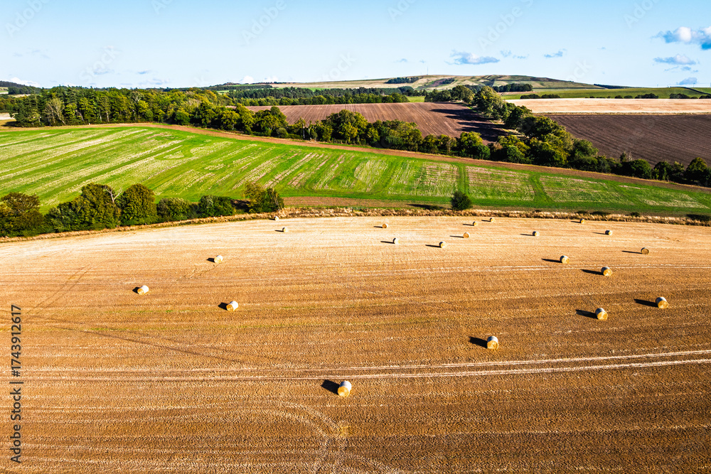 Straw bales in the Scottish fields from a drone, Southeast Scotland, UK