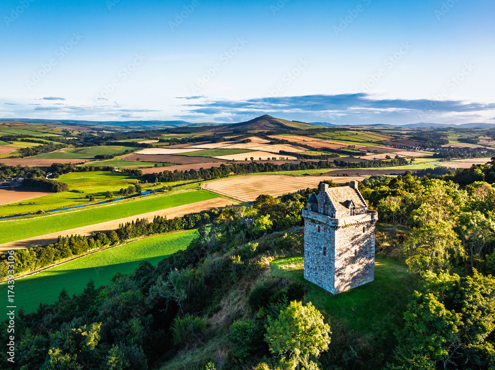 Fatlips Castle from a drone, Minto Crags, River Teviot, Roxburghshire, Scottish Borders, Scotland, UK