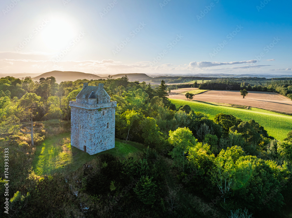 Fatlips Castle from a drone, Minto Crags, River Teviot, Roxburghshire, Scottish Borders, Scotland, UK