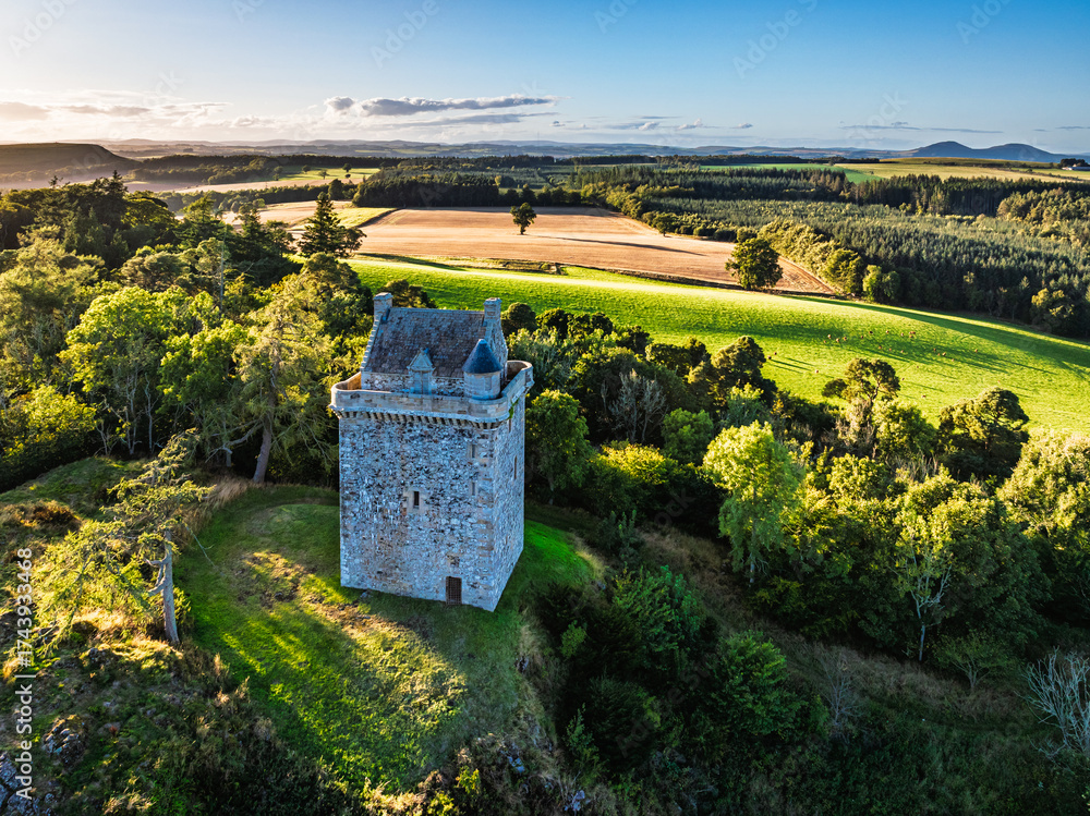 Fatlips Castle from a drone, Minto Crags, River Teviot, Roxburghshire, Scottish Borders, Scotland, UK
