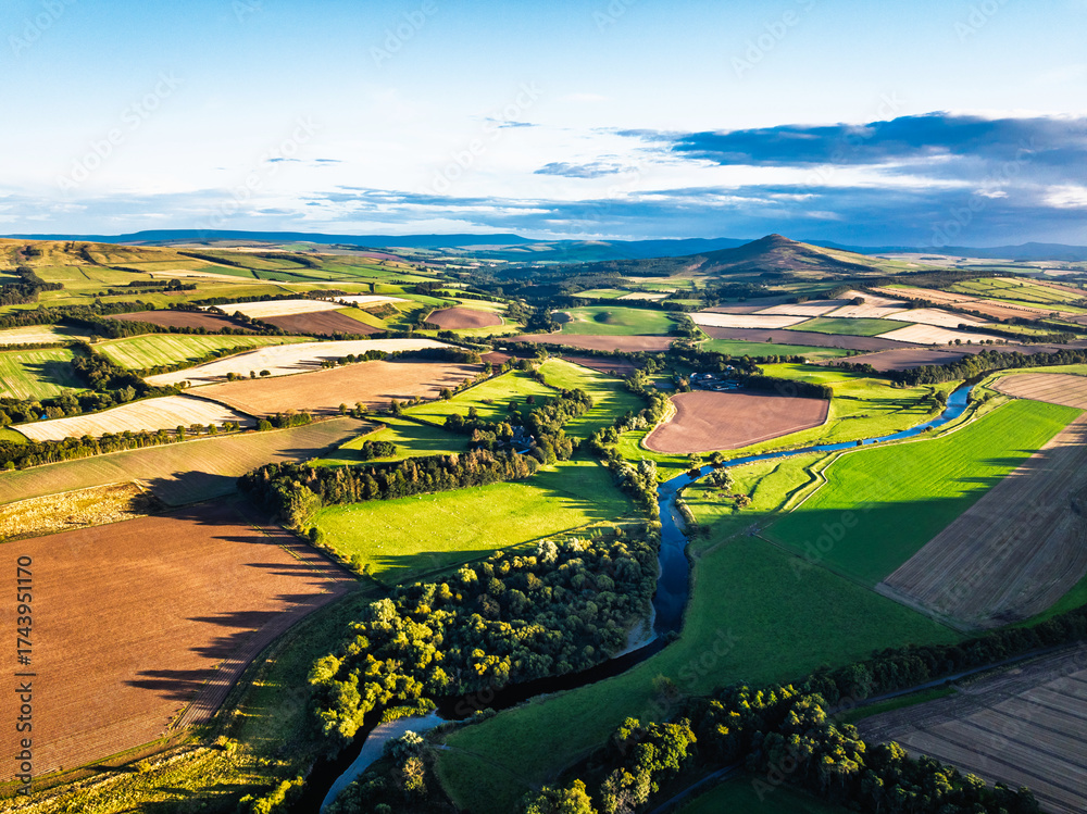 Fields and Farms over River Teviot and Minto Crags from a drone, Roxburghshire, Scottish Borders, Scotland, UK