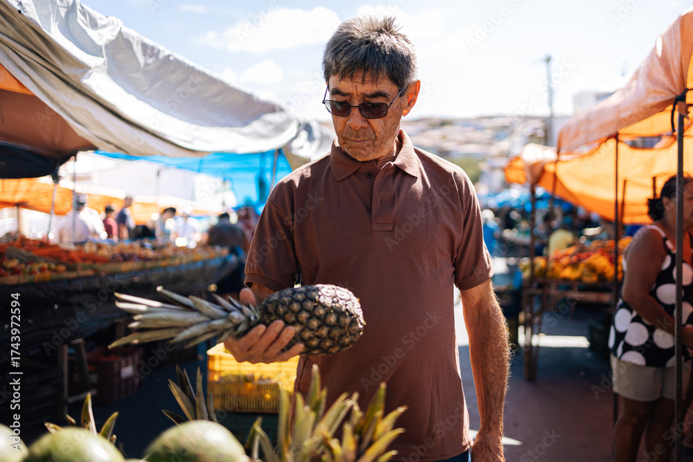 Senior man choosing a pineapple at a traditional open-air market in a small Brazilian town. Concept of healthy lifestyle, local economy, and everyday life in Brazil