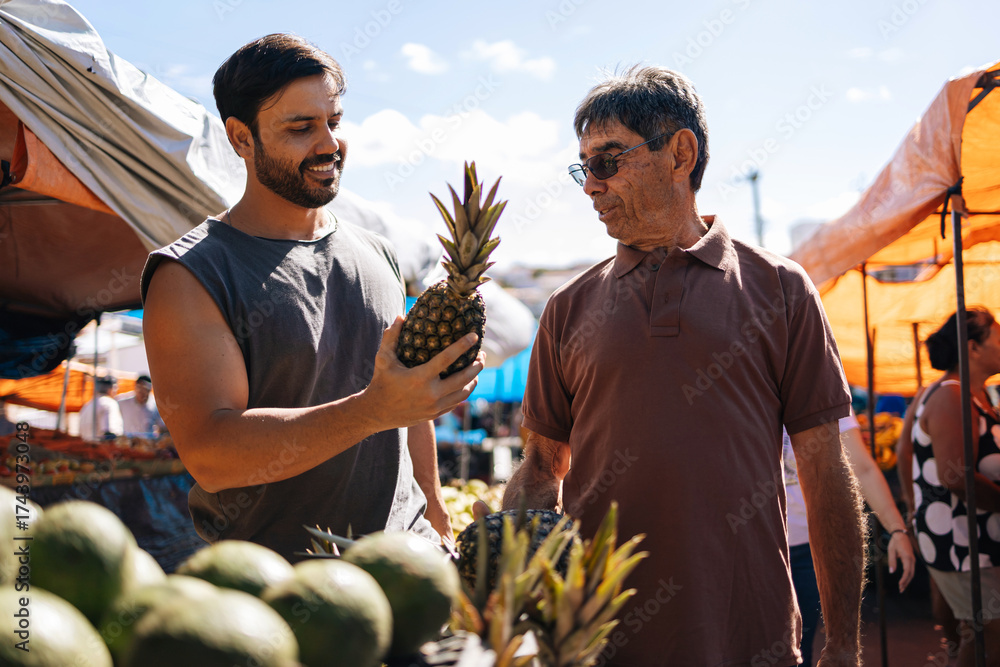 Adult son and elderly father selecting a pineapple together at an open-air market on a sunny day in a small Brazilian town
