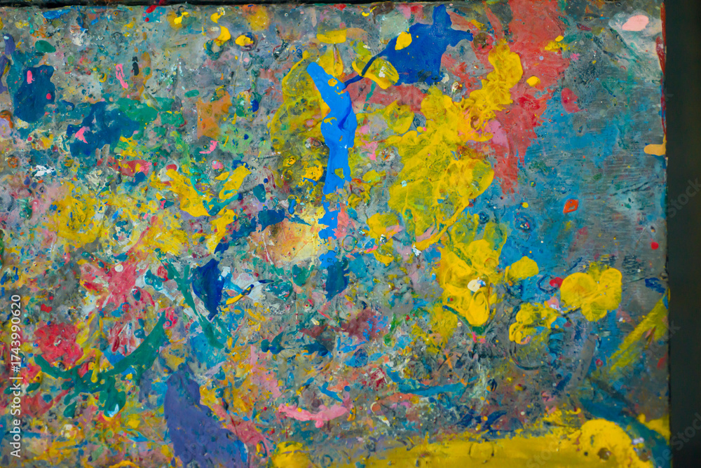 Abstract background of colorful acrylic paint splashes on a palette, closeup of photo