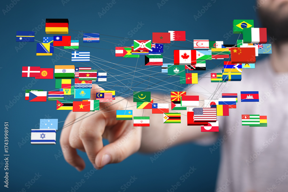Abstract depiction of interconnected flags symbolizing international relations, globalization, and global communication. The image promotes a se