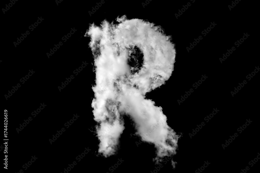 White capital letter R cloud shapes isolated on black background. Cloud alphabet