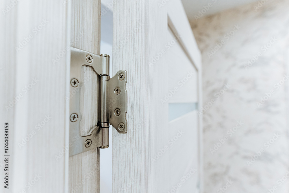 This image features a closeup view of a modern door hinge set within a beautifully bright interior environment, showcasing the details and design in a sophisticated and minimalistic manner