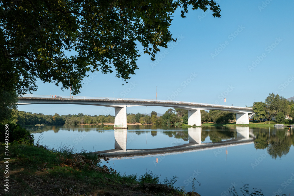 Ponte Moderna de Nossa Senhora da Guia sobre o rio Lima, com um forte reflexo sobre as águas, sob um céu azul em Ponte de Lima, Portugal