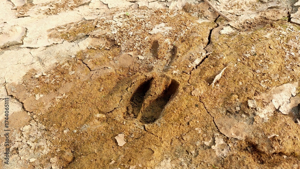 Closeup View of Deeply Cracked Earth Showing Clear Goat Hoof Print