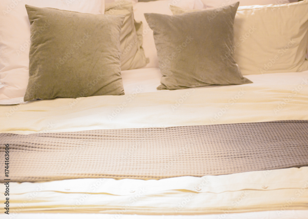 Close up of bedding sheets and pillows in hotel bedroom interior